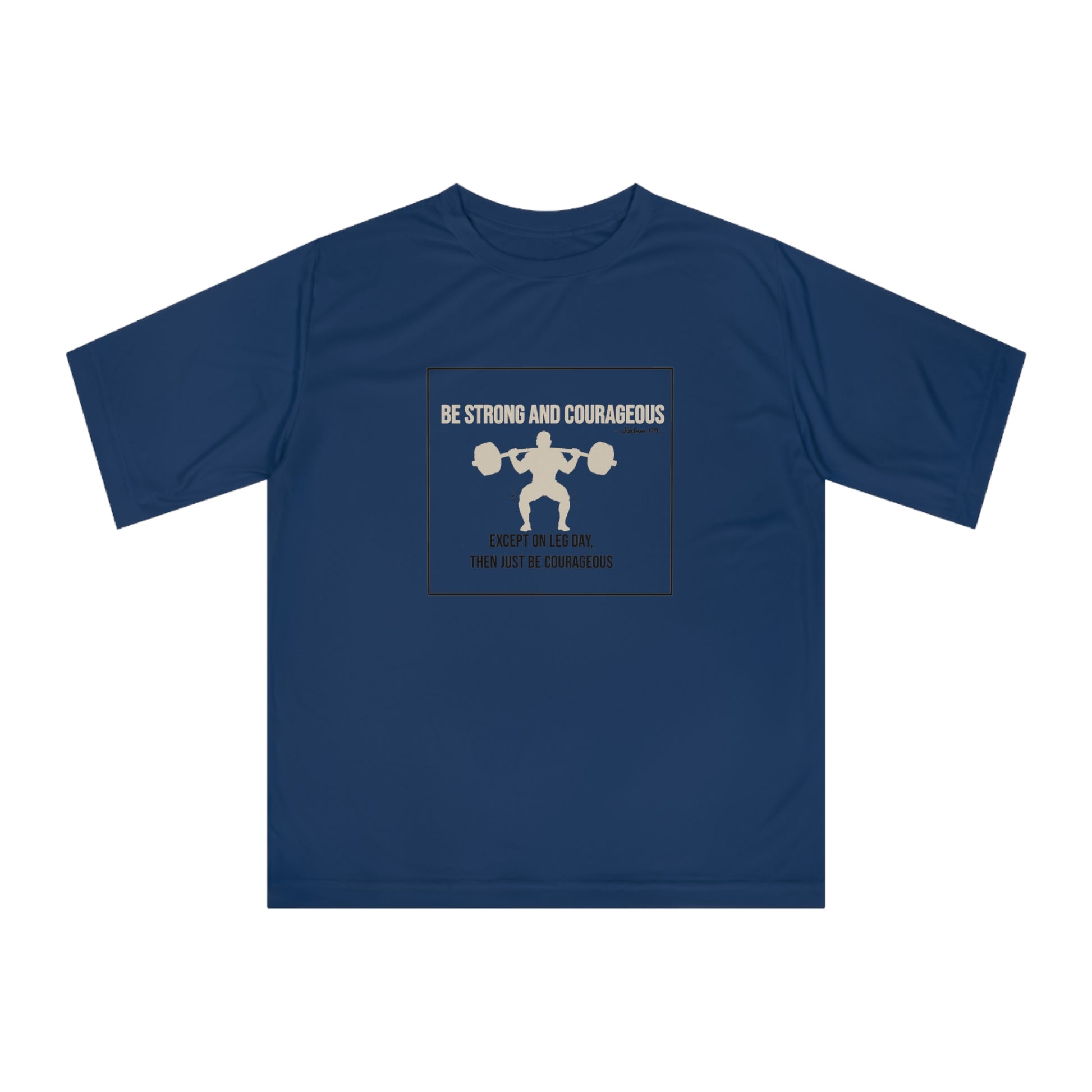 An athletic fit T-shirt with a fun design featuring a person squatting weights and the caption 'Be strong and courageous Except on leg day, then just be Courageous'. Made of 100% moisture-wicking polyester, this T-shirt is perfect for gym enthusiasts and fitness lovers. It provides UPF 40+ sun protection and features a direct-to-film print.