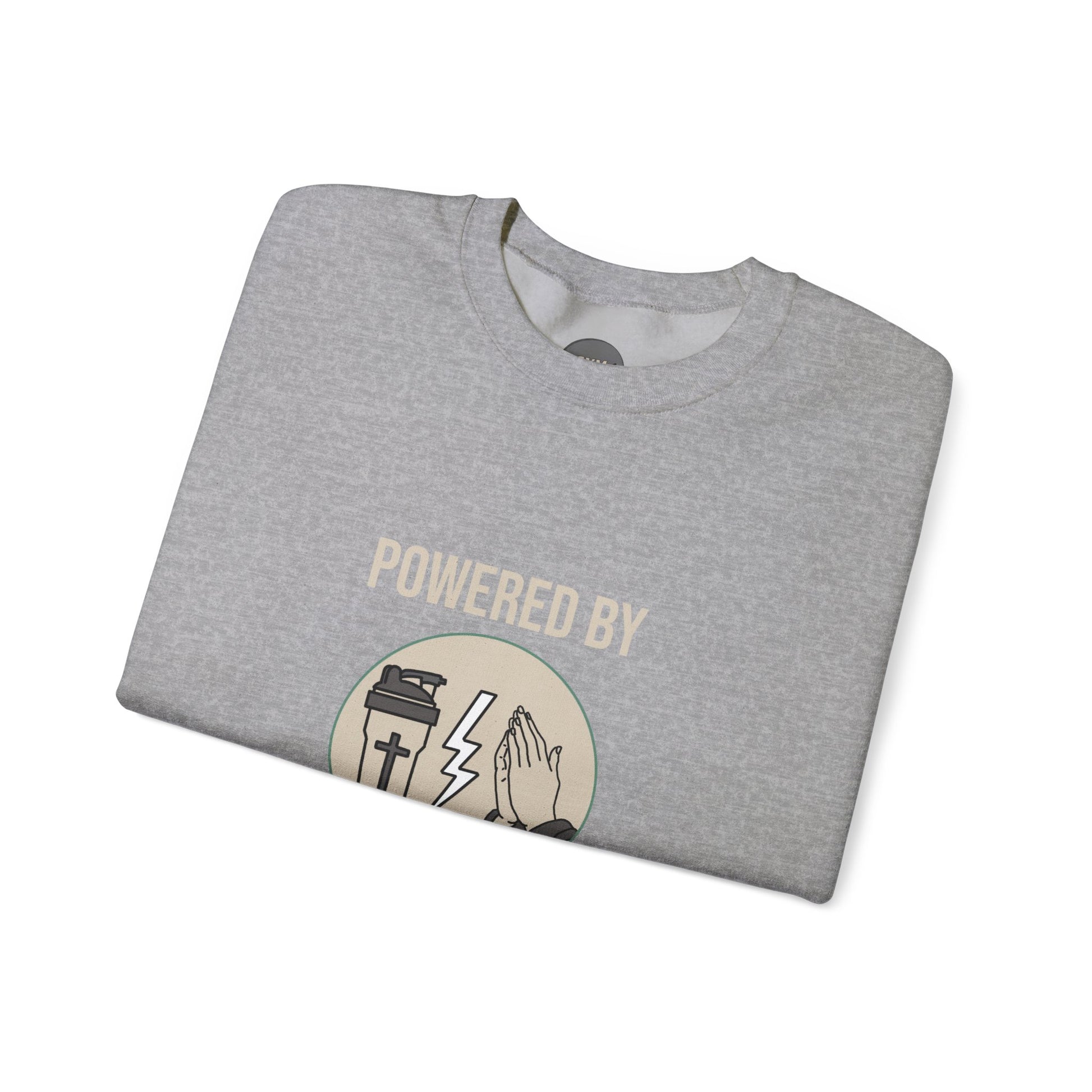 A comfortable and durable sweatshirt featuring a protein tumbler next to prayer hands with the tagline 'Powered by Protein and Prayer'. This sweatshirt provides a cozy fit with a classic crew neckline and double-needle stitching for top-tier durability. Perfect for adults looking for a unique and meaningful design that combines fitness and faith.
